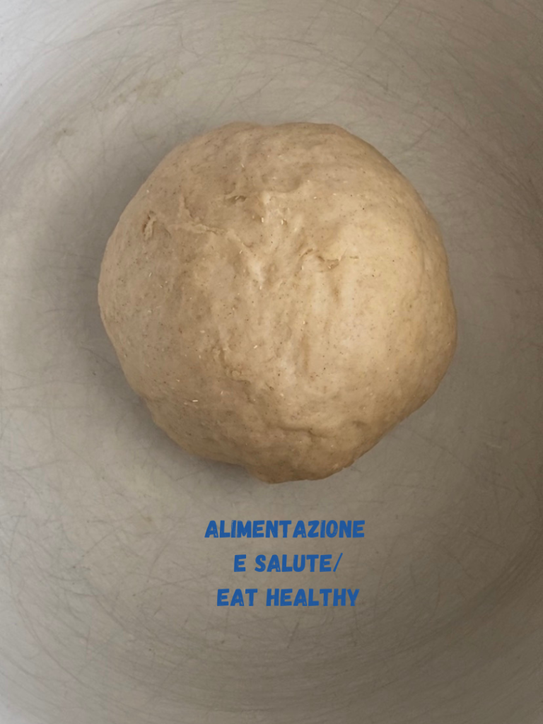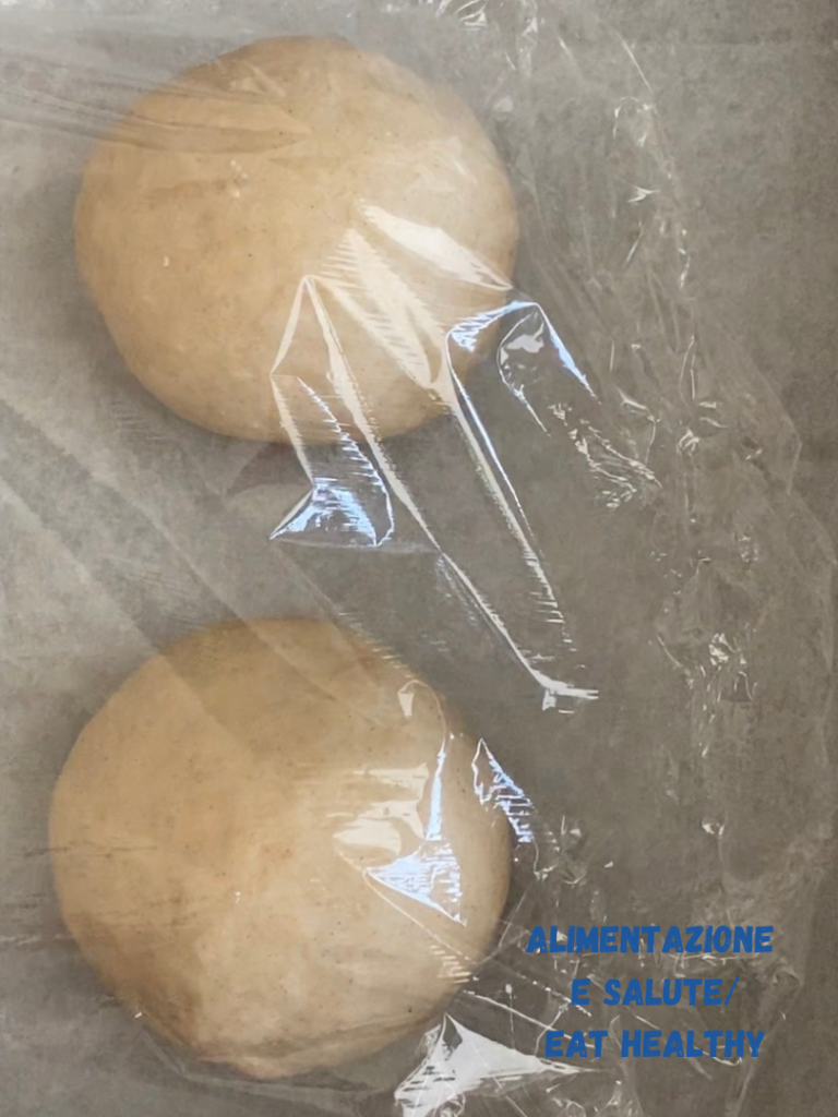 Former une boule et laisser lever dans un bol, couvert d’un film plastique dans le four éteint mais avec la lumière allumée jusqu’au doublement, comptez environ deux heures.