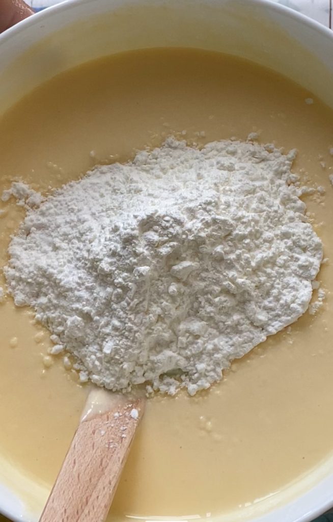 Ajouter cinq cuillères à soupe de fécule de maïs, environ 100 gr, et continuer à mélanger.