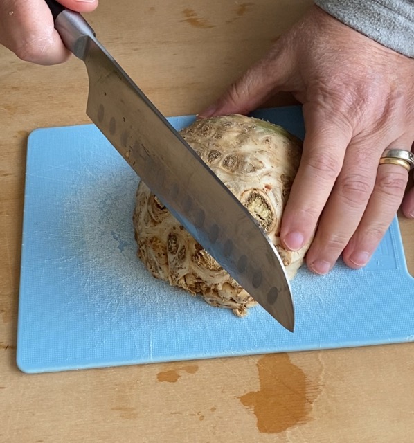 Pour les préparer, commencez par éplucher le céleri-rave et le couper en fines tranches ou en bâtonnets, selon vos préférences.