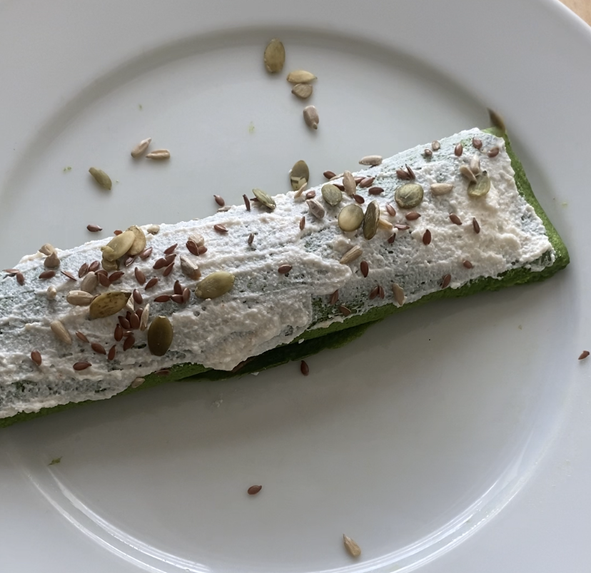 J’ai roulé la crêpe, l’ai tartinée de ricotta et ajouté un mélange de graines.