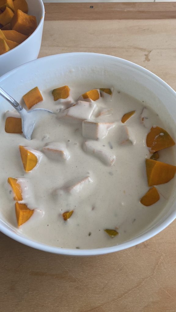 Avec un potiron, vous pourrez réaliser deux recettes car pour celle-ci, il vous en faudra environ 250 grammes, le reste pourra être cuit au four ou à la friteuse à air et utilisé comme accompagnement.