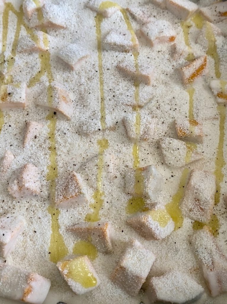 Verser un filet d’huile sur le mélange et enfourner pendant environ une heure à 200 degrés, activer la fonction grill les dernières minutes.