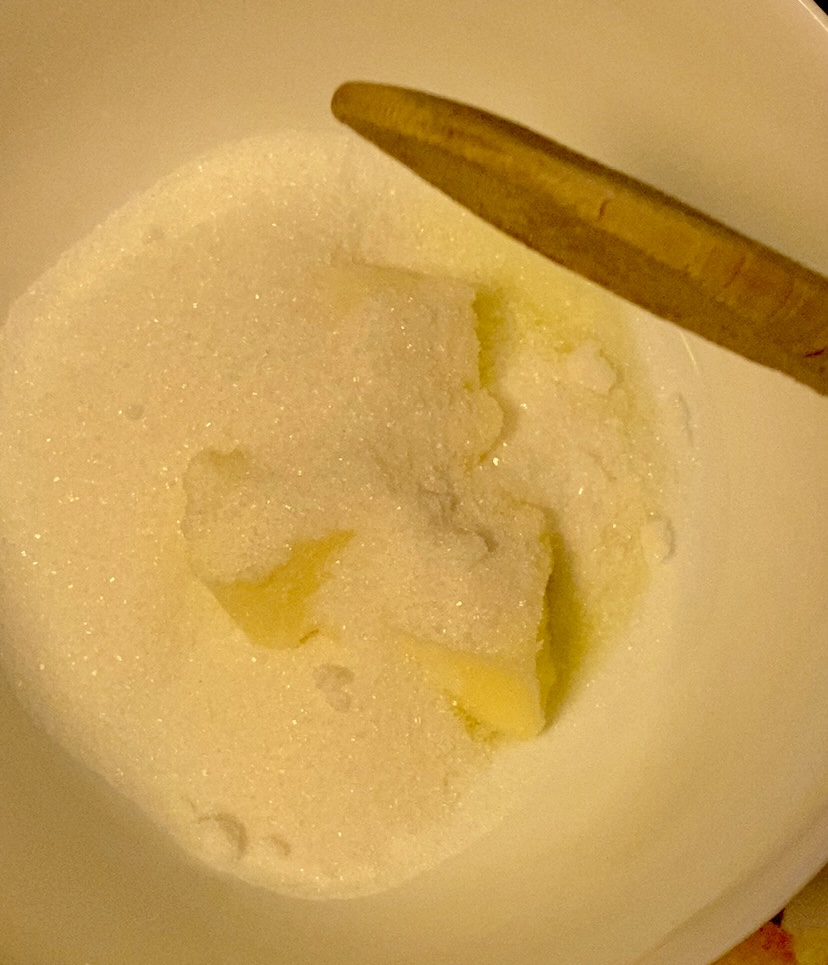 Travailler le beurre fondu au micro-ondes avec le sucre.