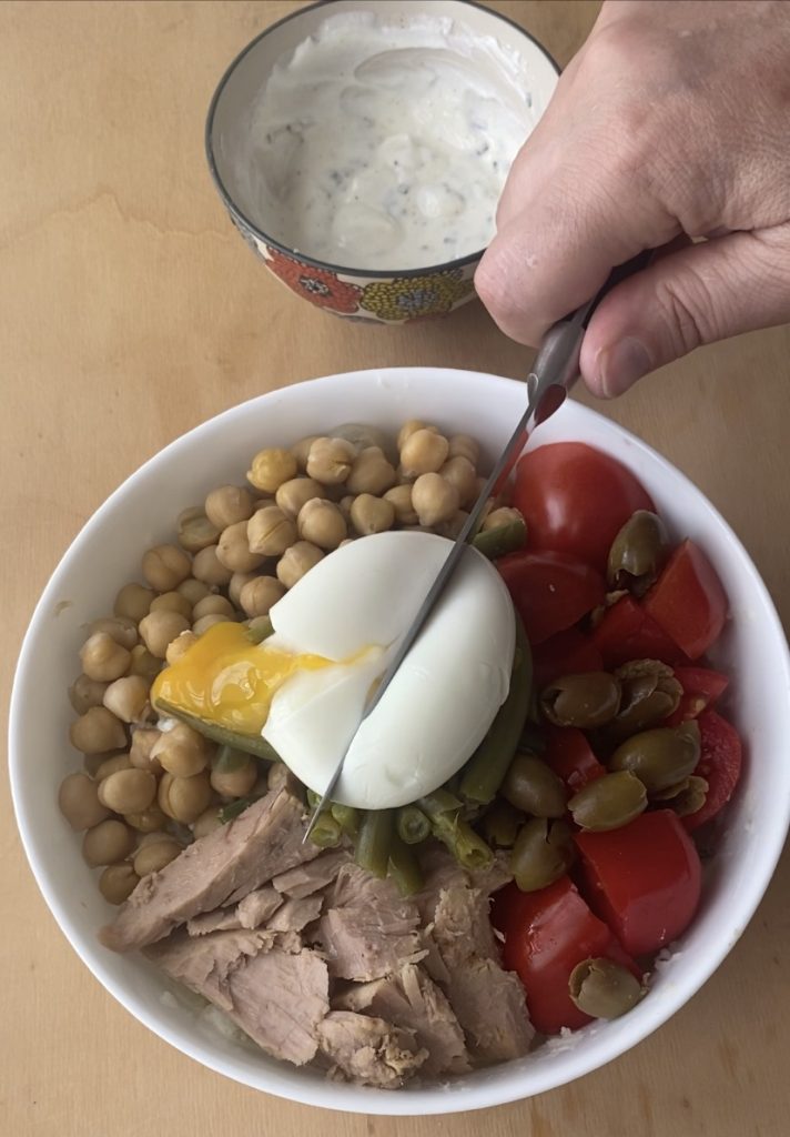 Ajouter les haricots verts et un œuf à la coque, pour le préparer j’insère les œufs dans une petite casserole avec de l’eau froide et à partir de l’ébullition, je cuis pendant une minute et demie.