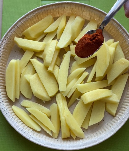 Transférer les pommes de terre dans un contenant pour friteuse et assaisonner avec une cuillère à café de paprika fumée.