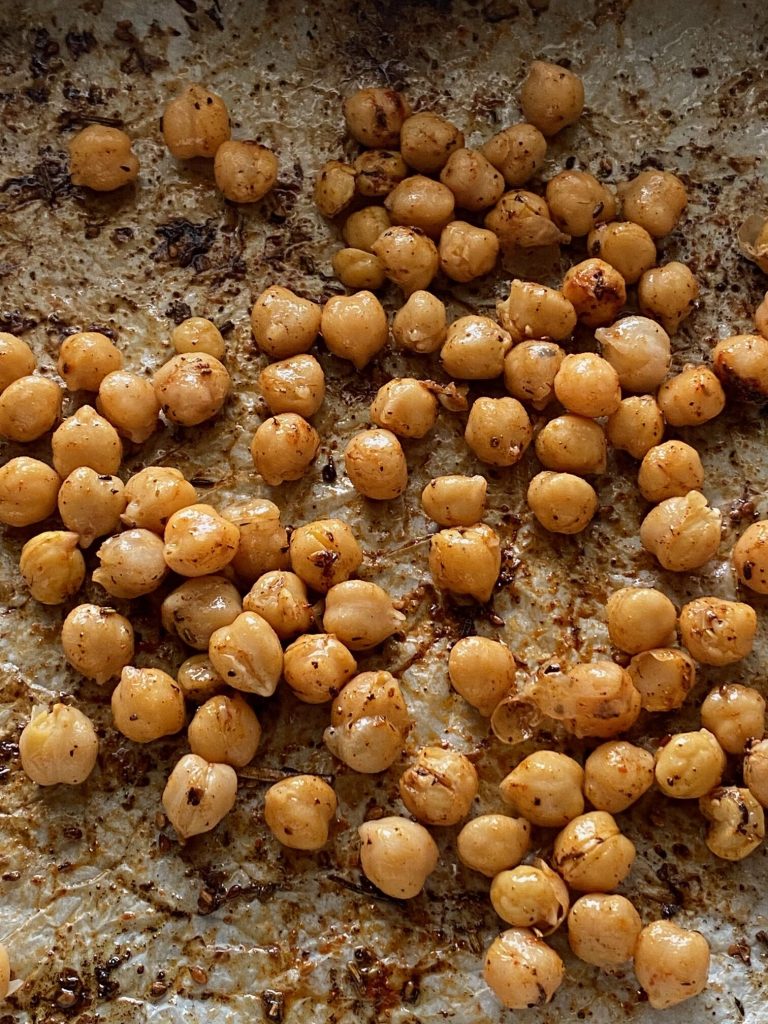 Si, comme moi, vous n’avez pas un four très grand, après avoir cuit les carottes, vous devrez procéder à la cuisson des pois chiches en les mettant dans un plat recouvert de papier sulfurisé, en les assaisonnant avec du paprika, un filet d’huile d’olive extra vierge et en les cuisant pendant 30 minutes à 200° degrés. N’oubliez pas de ne pas les mixer tous mais, de garder une cuillère pour garnir le plat.