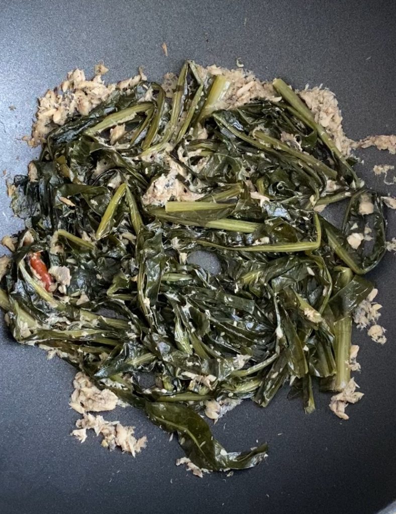 Ajouter les feuilles de puntarelle et cuire dans le wok avec un couvercle, ajuster le sel si nécessaire, puisque les anchois sont déjà salés.