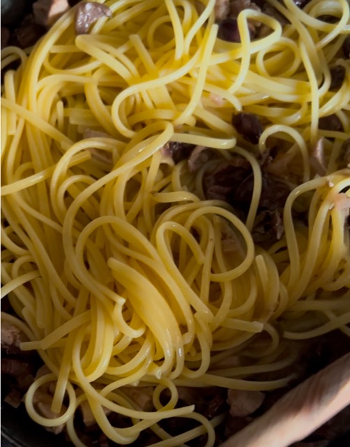 Laisse revenir à feu doux, en remuant de temps en temps, jusqu’à ce que l’oignon devienne translucide et que les anchois fondent. En attendant, jette les pâtes car le temps de cuisson te permettra de conclure la cuisson de la sauce.