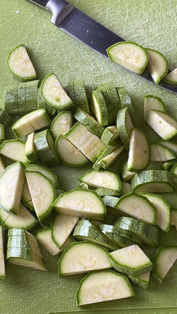 Transférer dans une poêle les trois courgettes restantes coupées en morceaux.