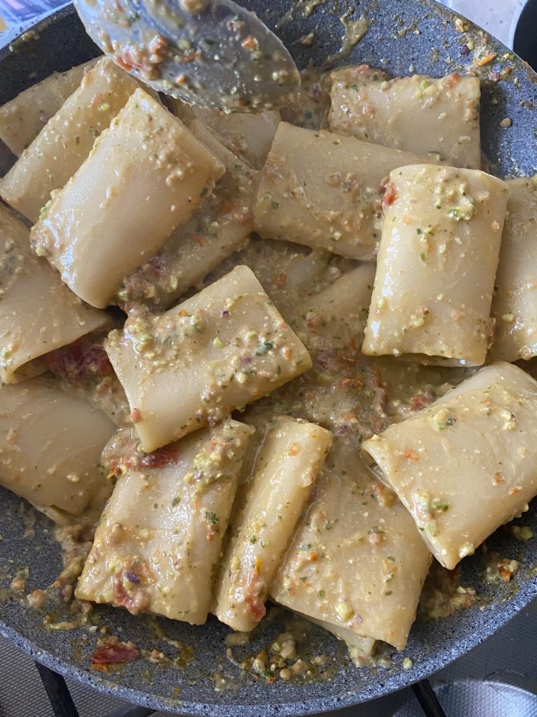 Ingrédients: pâtes avec pesto de pistaches, mixé et mange