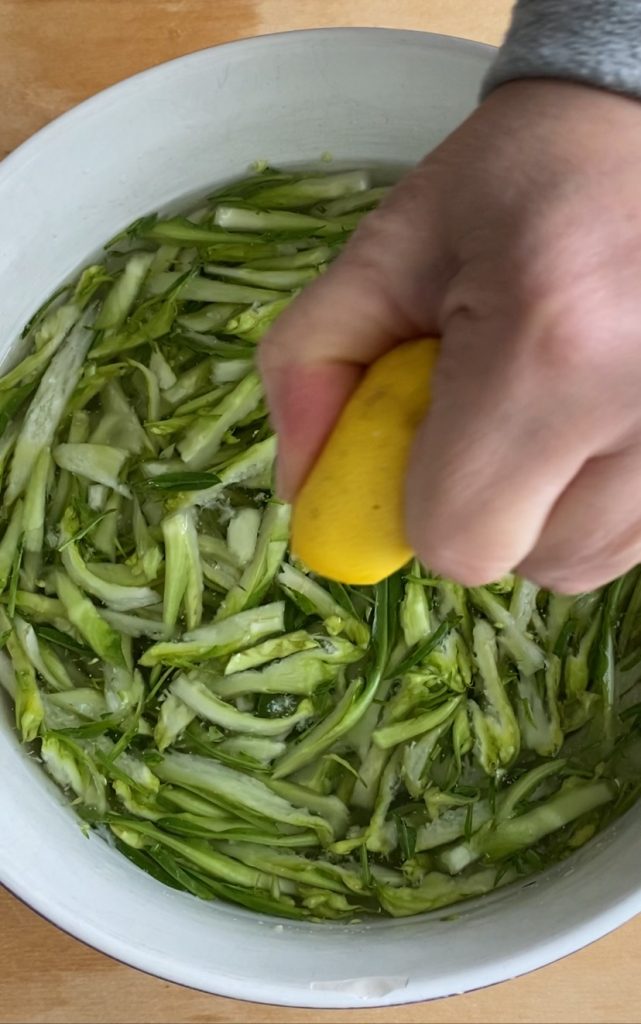 Égoutter les puntarelle, les assaisonner avec le citron.