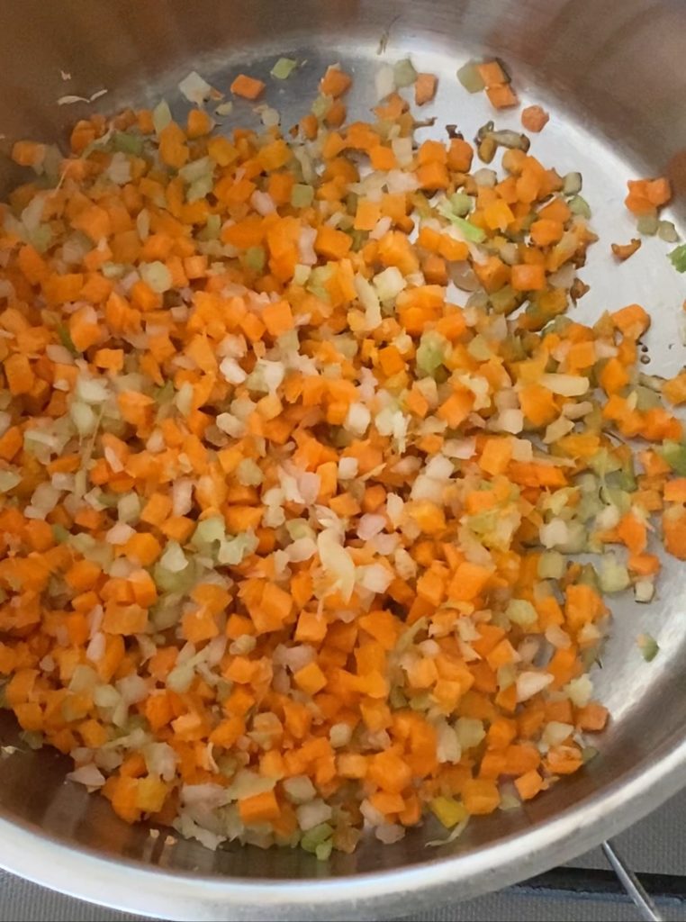 • D’abord, dans une casserole à fond épais, ajoutez de l’huile et ajoutez la carotte, le céleri et l’oignon finement hachés, faites revenir.