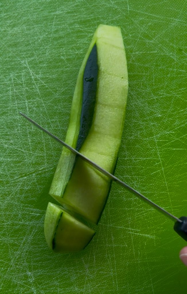 Lave les concombres, puis coupe-les en gros morceaux. Presse-les pour éliminer l’excès d’eau. Si la peau est trop épaisse, tu peux l’enlever.