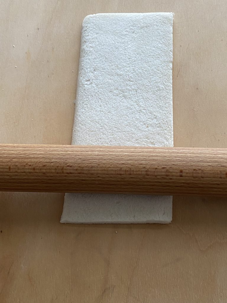 Déposer sur une planche à pâtisserie une tranche de pain pour sandwichs et passer le rouleau à pâtisserie dessus pour l’affiner.
