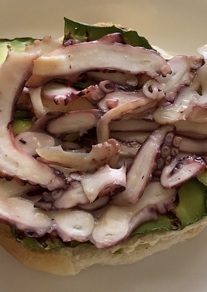 Octopus sandwich : En Italie, le pays de la mer et de la bonne cuisine, il y a un village magnifique en Pouilles, Polignano a Mare (ville natale de Domenico Modugno, le chanteur de « Volare ») où vous pouvez déguster un incroyable sandwich de poulpe chez ‘Pescaria’, une sorte de « fast-seafood » d’excellence. Voici ma version personnelle, que je trouve également très appétissante.