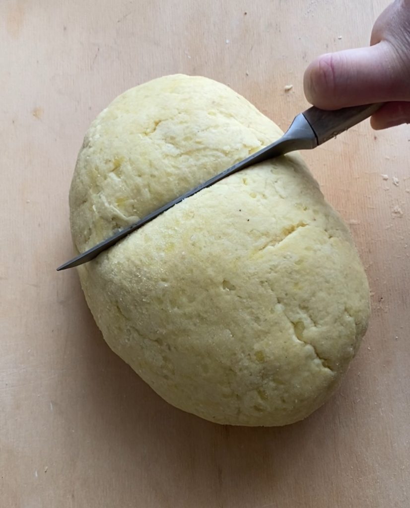 Diviser le pain de manière à utiliser une partie pour la base de la tarte salée et une partie pour former les bandes classiques qui décoreront la tarte.