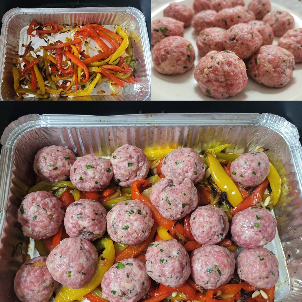 J’ai préparé les boulettes avec un mélange de bœuf et de porc haché, sans œufs. J’ai utilisé deux poivrons et j’ai tout cuit, comme toujours, avec mon alliée culinaire Ninja Combi.