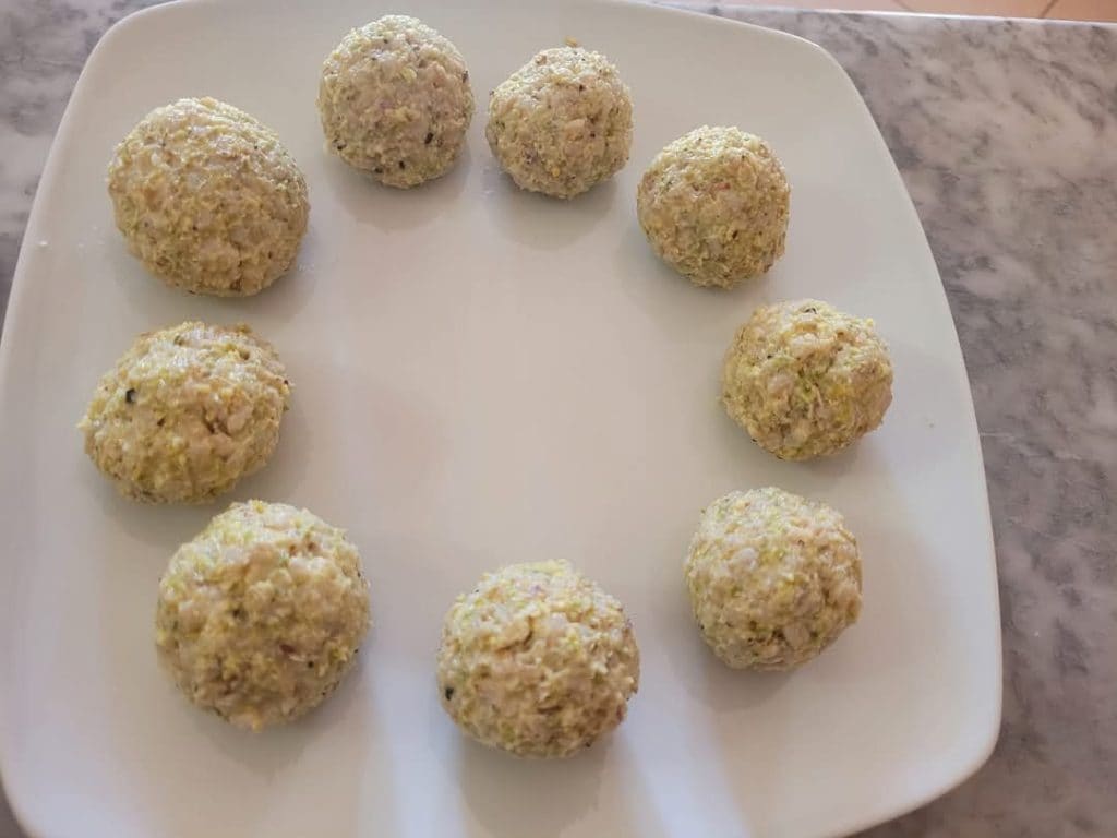 Humidifiez vos mains, prenez une portion du mélange et insérez un cube de scamorza au centre.