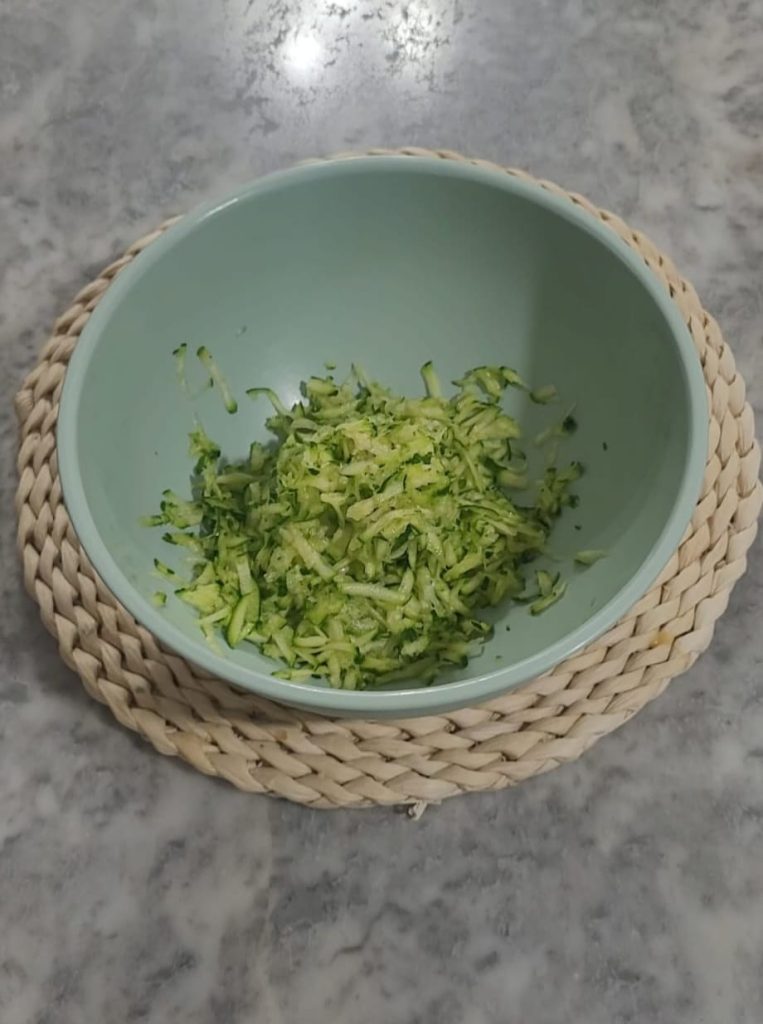 Commencez par la courgette. Après l’avoir lavée et séchée, retirez les deux extrémités et râpez-la avec une râpe à gros trous. Pressez-la bien avec les mains pour éliminer le liquide de végétation