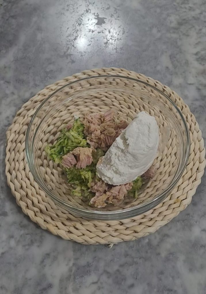 Dans un autre saladier, rassemblez les courgettes pressées, le thon et la ricotta