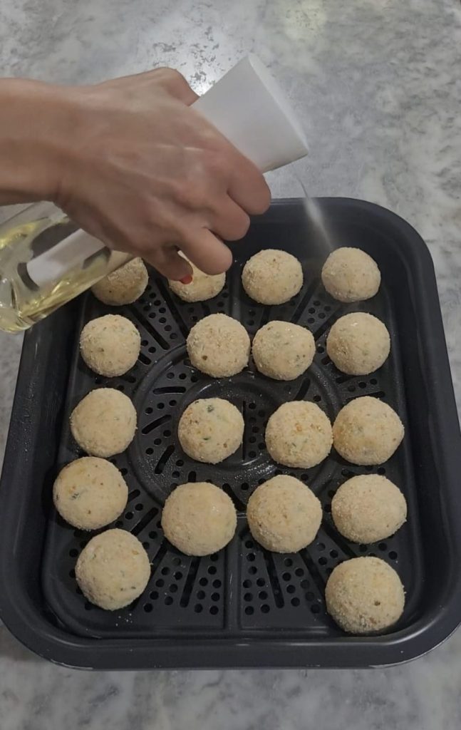 Transférez les boulettes directement sur la grille de votre friteuse et vaporisez quelques pulvérisations d’huile sur toutes les boulettes