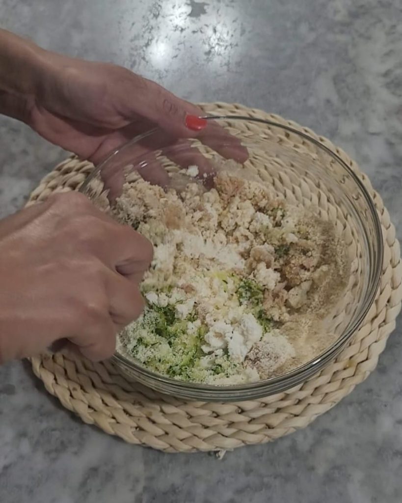 Mélangez bien avec une fourchette les ingrédients. Si le mélange obtenu est trop mou, ajoutez encore de la chapelure jusqu’à obtenir la consistance souhaitée