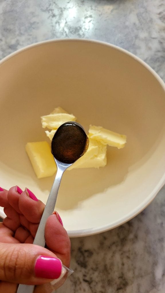 Dans un autre bol, mettez le beurre mou avec une cuillère à café d’extrait de vanille