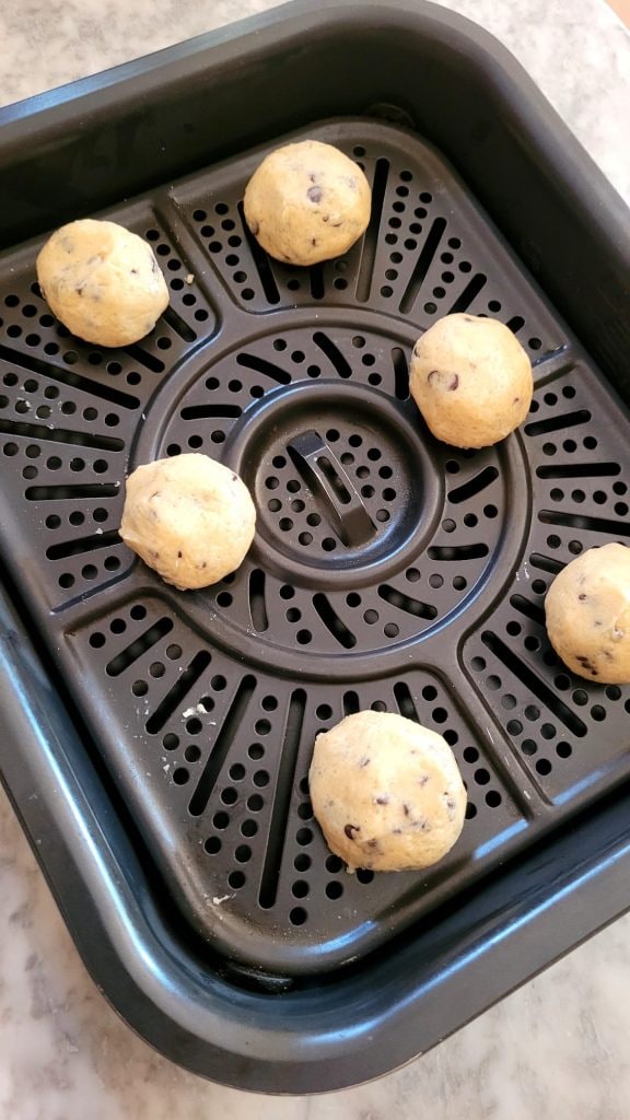 J’ai évidemment cuit les Cookies, comme vous le savez maintenant, à la friteuse à air, mais comme je vous le dis toujours, ils peuvent être cuits tranquillement au four. Vu la forme typique ronde et large des biscuits, je comprends que l’utilisation de la friteuse, si elle n’est pas particulièrement grande, vous conduirait à de nombreuses cuissons supplémentaires. Même moi, j’ai dû le faire, malgré le fait que la mienne soit très spacieuse, car la forme en boules que nous donnerons à la pâte obtenue s’aplatira et s’élargira sur la plaque pendant la cuisson, c’est pourquoi elles doivent être placées bien espacées les unes des autres. Ayant une friteuse à air en forme de four, j’ai alterné plateau et grille air fry pour accélérer un peu le tout. Pendant que je cuisais les premiers, je gardais les autres au réfrigérateur, afin qu’ils ne ramollissent pas trop en attendant d’être enfournés.