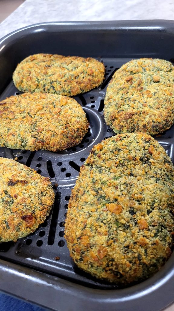 Les côtelettes d’épinards peuvent aussi être congelées cuites, vous pouvez les décongeler et les réchauffer à la friteuse à air à 180° x quelques minutes ou congelées toujours à 180° x environ 15/20 minutes, le temps peut varier selon la quantité et le modèle de friteuse