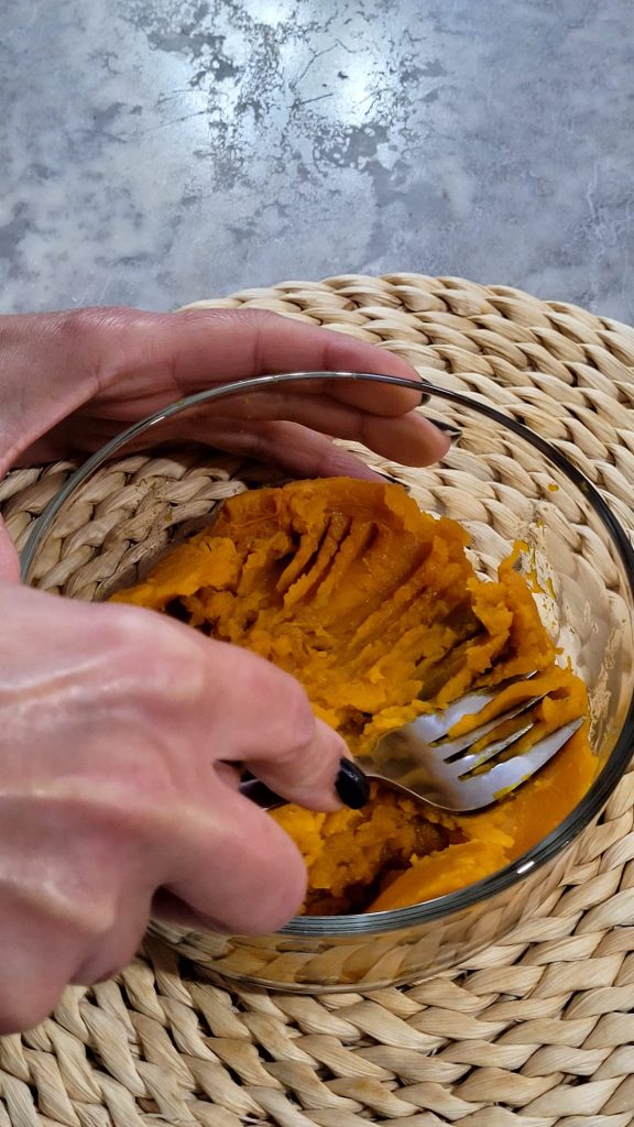 Prélevez la chair de la courge avec une cuillère et transférez-la dans un bol. Écrasez-la avec une fourchette pour obtenir une purée douce. Ajoutez du sel, du poivre et de la ciboulette, vous pouvez l’utiliser séchée ou fraîche. Mélangez bien
