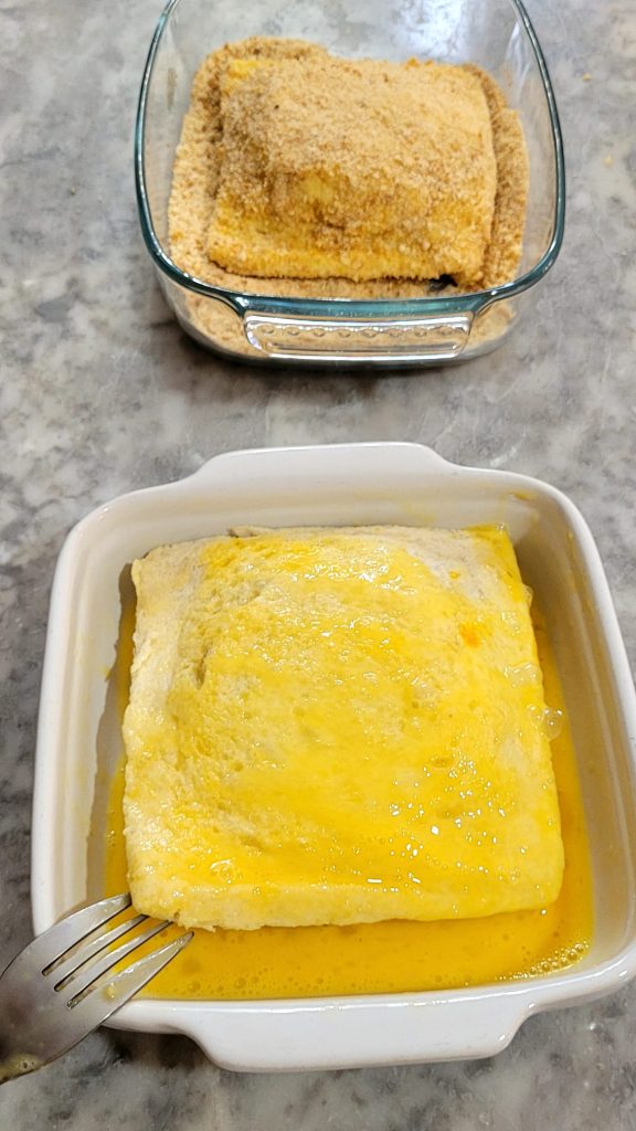 Maintenant, prenez deux petites plaques, dans l’une mettez les œufs légèrement battus et dans l’autre la chapelure