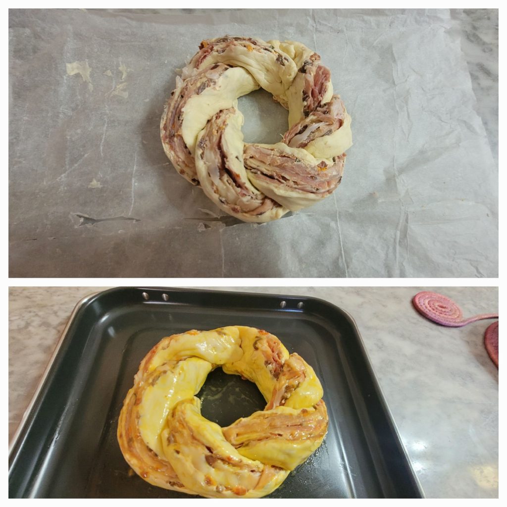 • Humidifier légèrement avec un peu d’eau les deux extrémités, pour bien les faire adhérer et les unir, en formant un cercle. Badigeonner la couronne avec un œuf battu et la transférer dans un plat sans papier sulfurisé. Cuisson programme Bake (ou Air Fry) 170° x 18 minutes