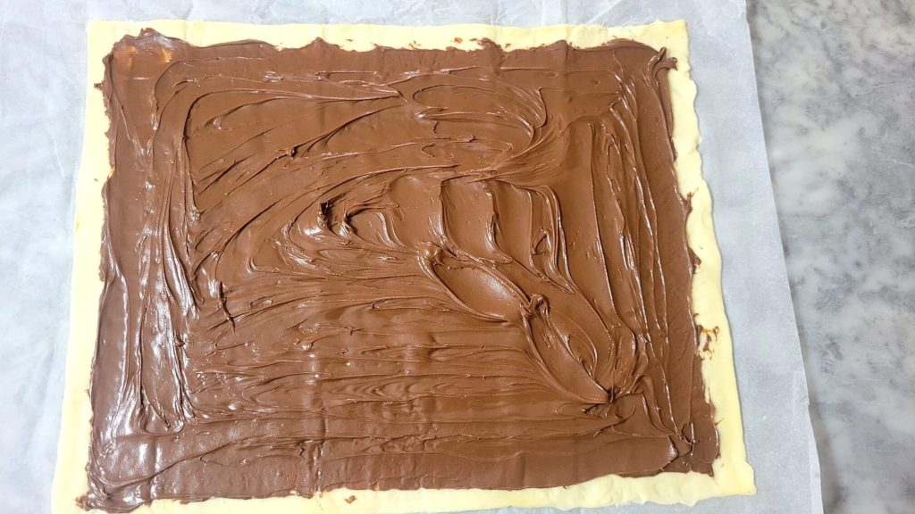 • Déroulez la pâte et étalez la Nutella avec l’aide d’une spatule ou du dos d’une cuillère, en laissant un bord d’environ 1 cm