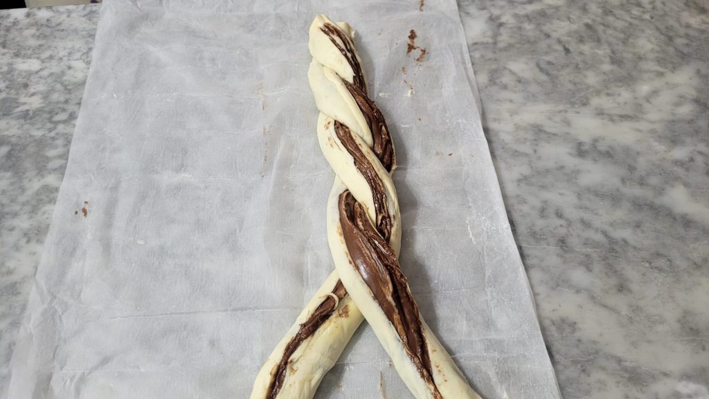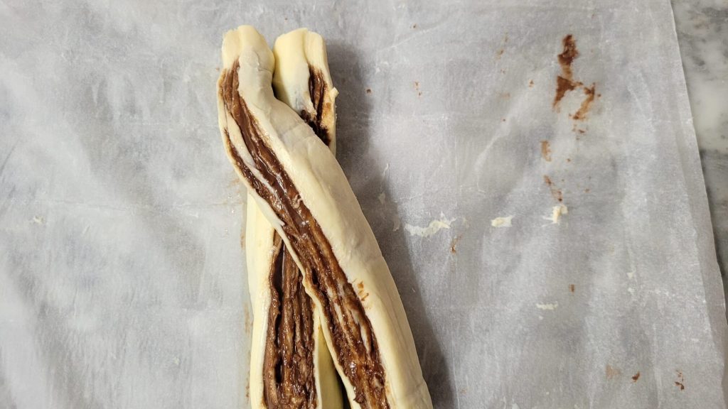 Comme je vous disais, pour préparer la Couronne de Pâte Feuilletée à la Nutella, il faut quelques minutes et très peu d’ingrédients : un rouleau de pâte feuilletée rectangulaire et de la Nutella. Il suffit d’étaler la crème sur la pâte, de la rouler, de la couper en deux et de l’entrelacer, mais cela, vous le verrez mieux dans la section des étapes.