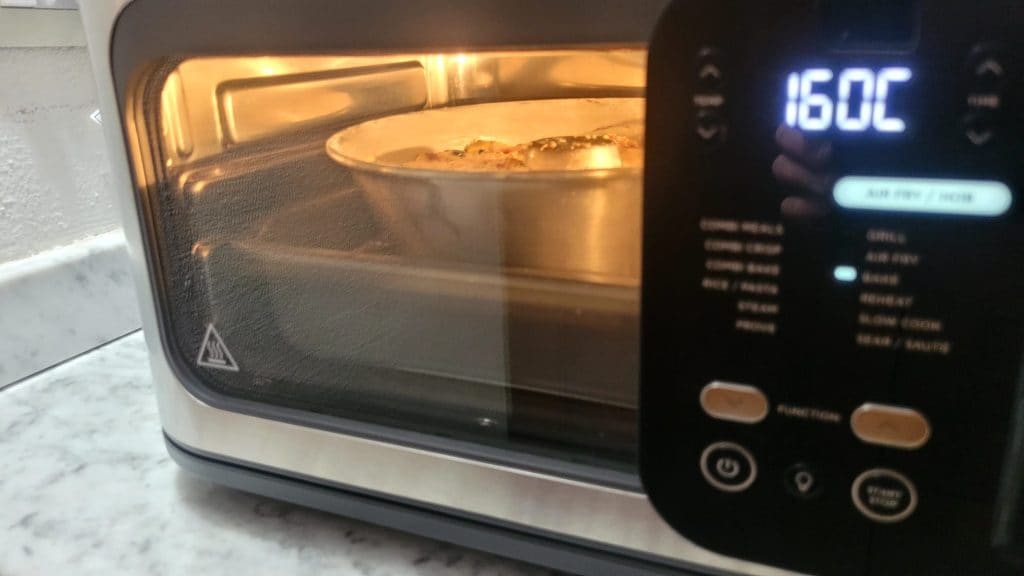 • Préchauffez la friteuse à air pendant quelques minutes et insérez le moule au-dessus du gril. Cuire à 160° pendant 35 minutes ou jusqu’à ce que la surface soit dorée. Faites toujours le test du cure-dent qui doit être sec