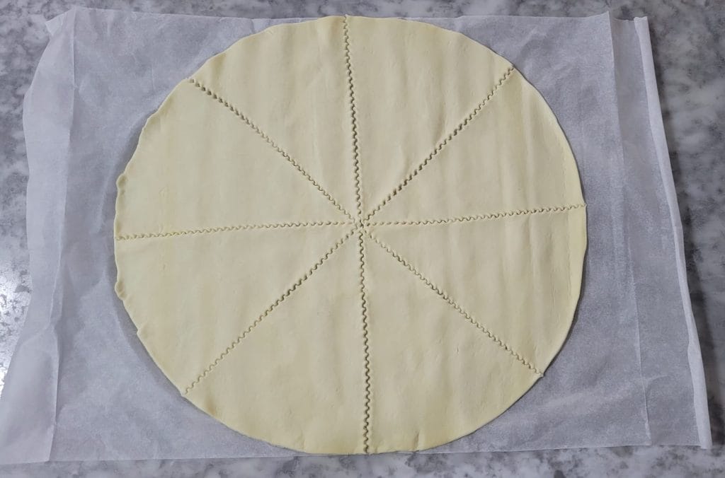 Déroulez la pâte sur un plan de travail et avec la roue, dentée ou lisse, découpez-la en croix pour obtenir quatre grands triangles