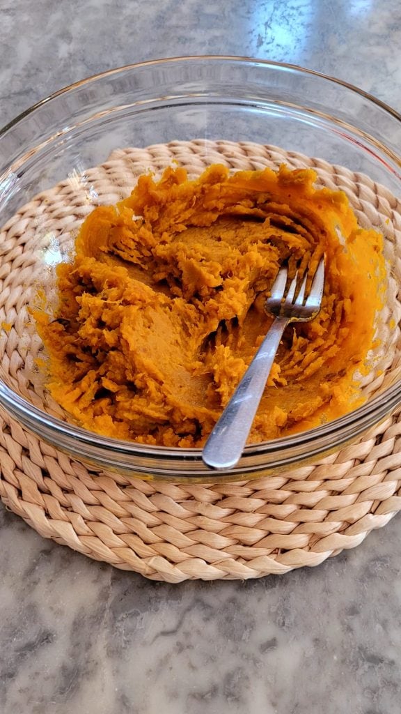 Dès que le potiron a tiédi, retirez la peau et transférez-le dans un bol et écrasez-le avec une fourchette