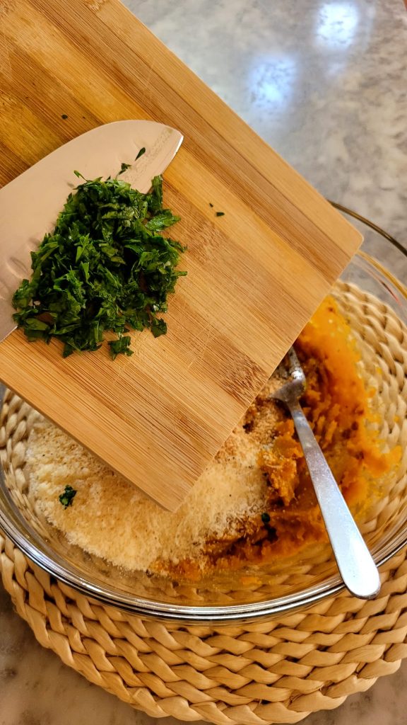Après avoir réduit le potiron en purée, ajoutez les ingrédients : le parmesan, l’œuf, le sel, le poivre et la noix de muscade