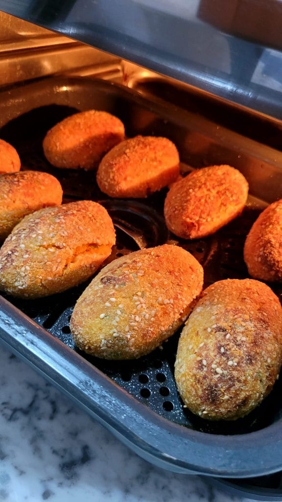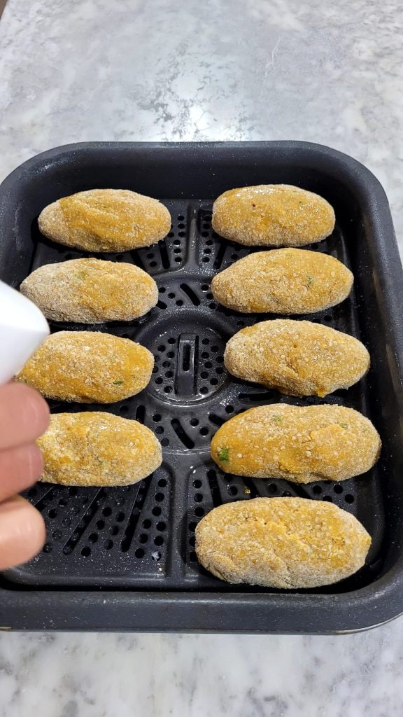 Disposez les croquettes sur la grille de la friteuse sans les superposer et donnez quelques pulvérisations d’huile