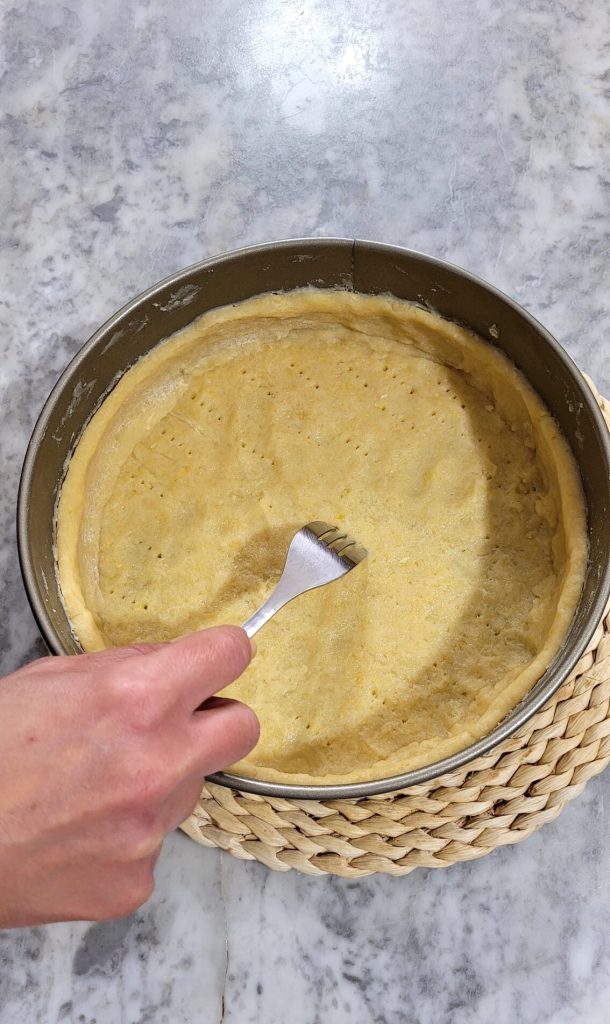 Piquez le fond avec les dents d’une fourchette pour éviter qu’il ne gonfle pendant la cuisson.