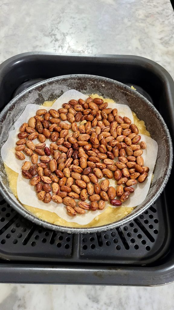 Entre-temps, préchauffez la friteuse à 180° pendant 2/3 minutes. Découpez le papier sulfurisé, recouvrez le fond de la tarte et répartissez les haricots secs ou les perles. Transférez le moule sur la grille de la friteuse