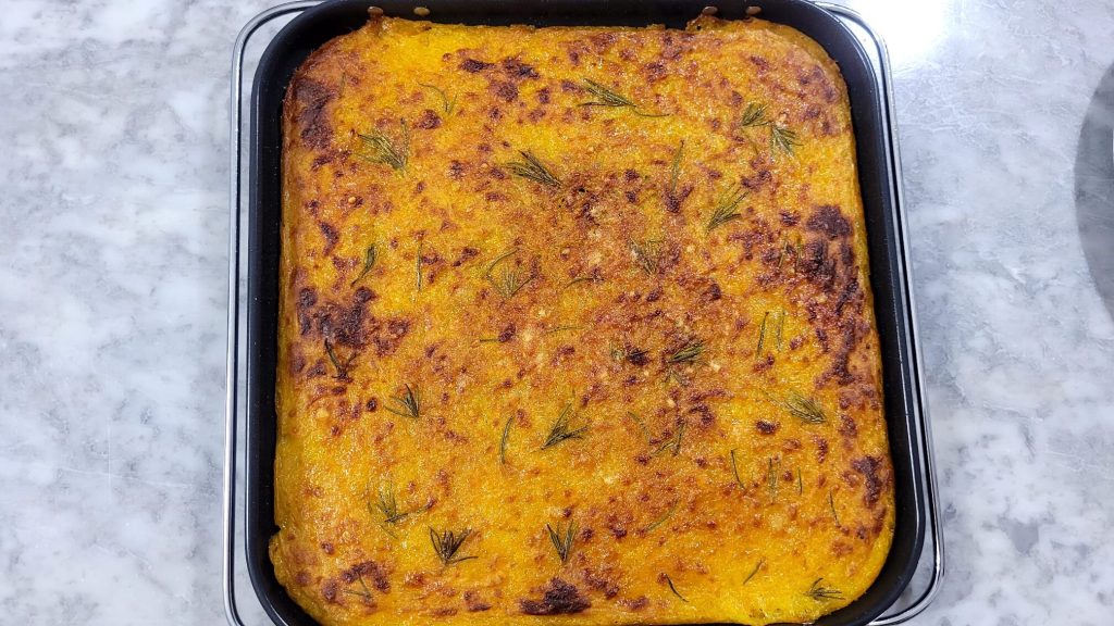 Et après la Focaccia de Pommes de Terre en Friteuse à Air, voici une autre tarte salée sans levée simple et facile à servir comme entrée et apéritif, mais aussi comme plat principal : la Focaccia de Potiron cuite en Friteuse à Air. Les ingrédients sont les mêmes, eau, huile d’olive extra vierge, farine, sel, poivre, grana padano, romarin et à la place des pommes de terre râpées, le potiron. On mélange tout dans un bol et directement dans la friteuse pour cuire.