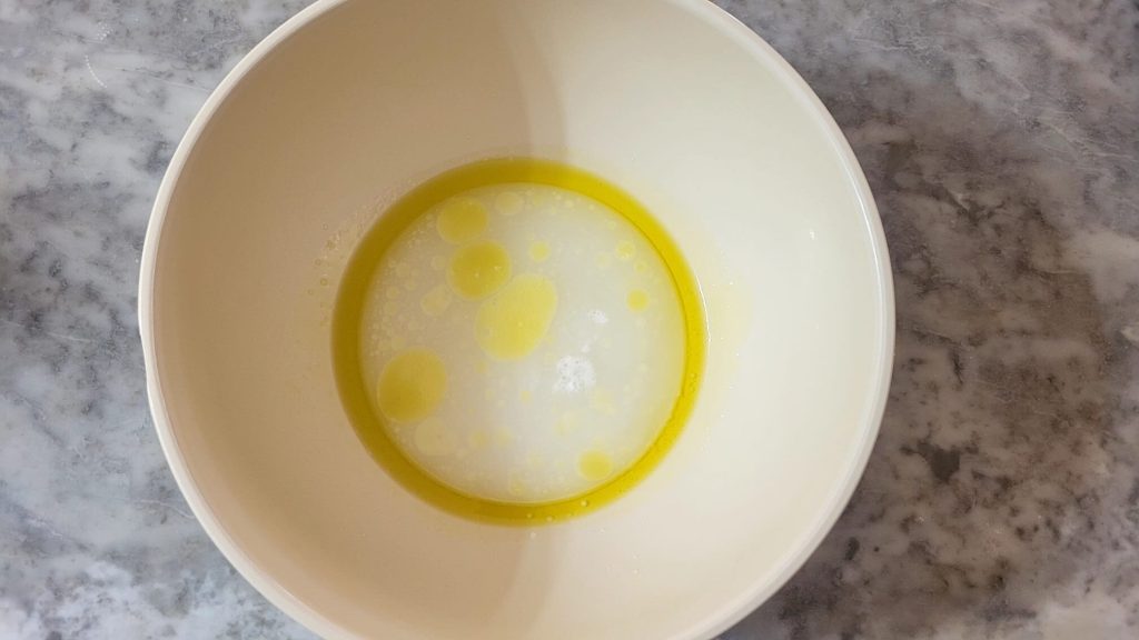 Versez dans un bol et faites dissoudre le sel, le sucre et la levure avec l’eau et l’huile, en mélangeant avec un fouet