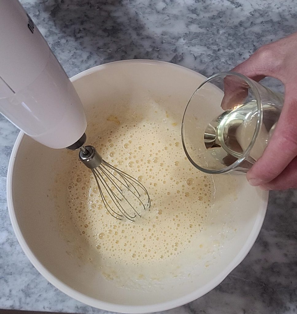 Ajoutez l’huile de tournesol en filet et continuez à incorporer au fouet