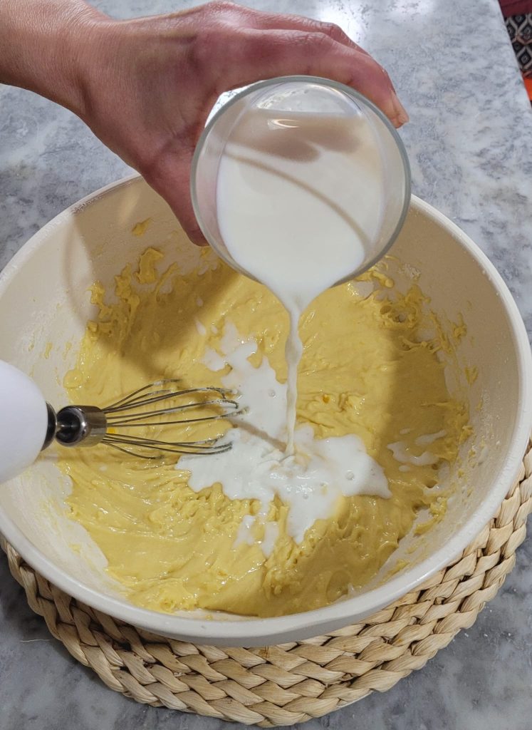 Maintenant, ajoutez la farine et la levure tamisées en mélangeant toujours avec les fouets
