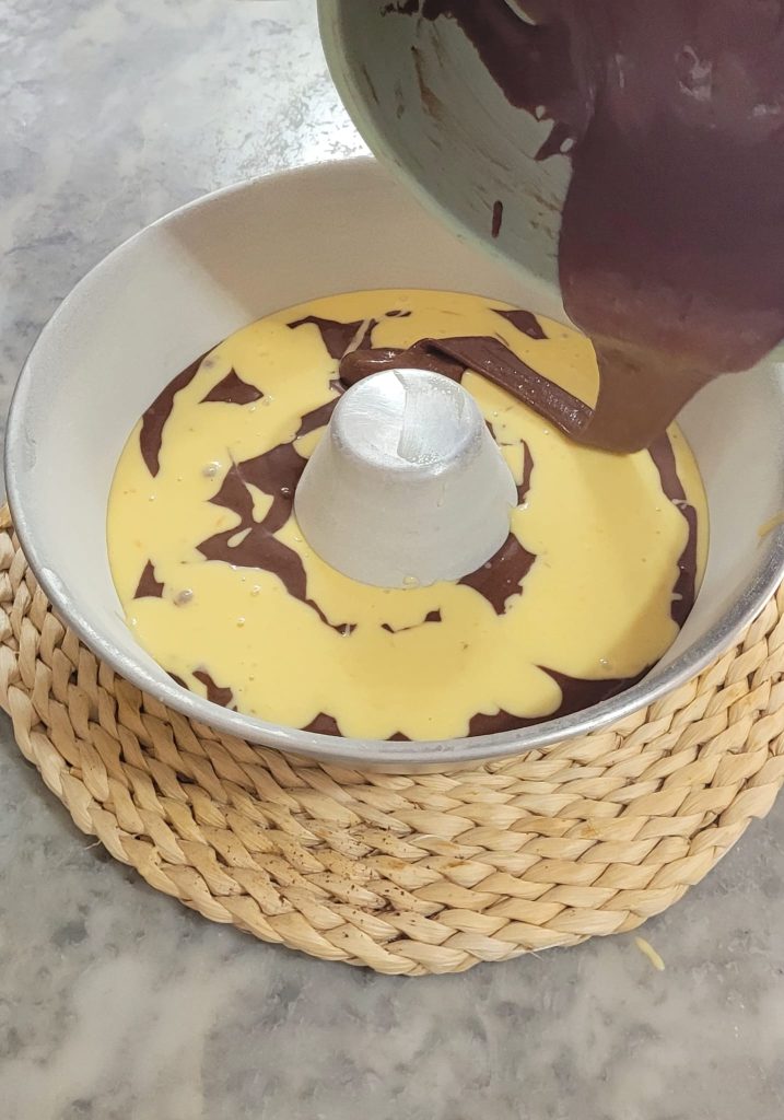 Poursuivez en alternant les deux pâtes en versant celle au chocolat sur celle blanche et vice versa jusqu’à les épuiser complètement