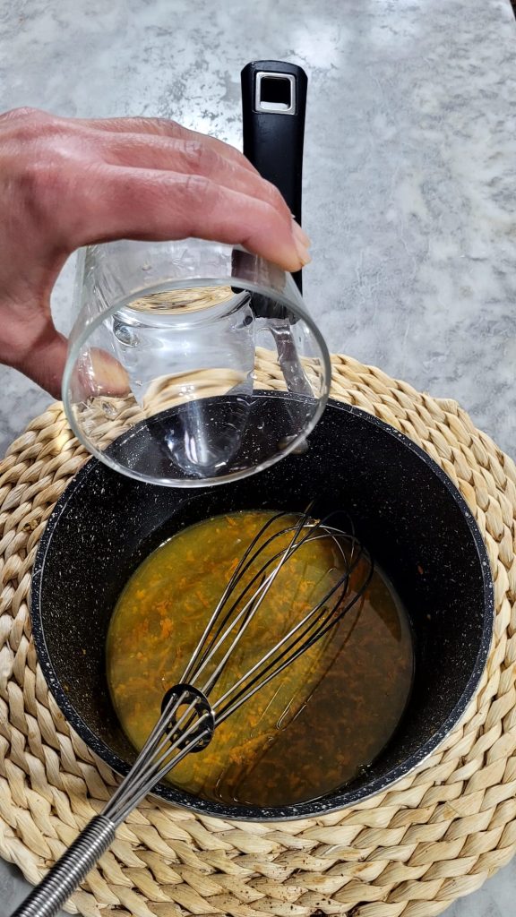 Pendant que le gâteau refroidit, préparez le sirop à l’orange. Râpez le zeste et récupérez le jus d’une orange. Mettez-les dans une casserole avec le sucre, mélangez avec un fouet et faites-le fondre. Ajoutez également l’eau et transférez sur le réchaud