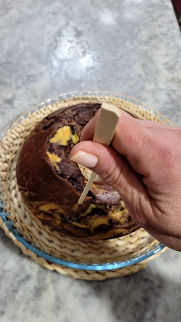 À la fin de la cuisson, faites le test du cure-dent à plusieurs endroits : s’il est sec, le gâteau est prêt, sinon continuez quelques minutes.