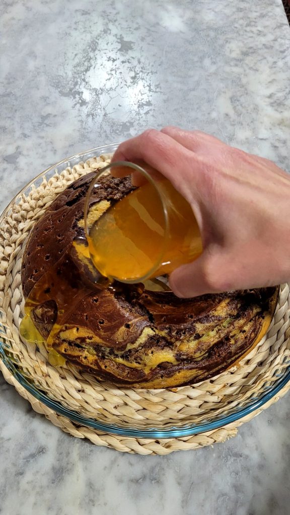 Maintenant que votre gâteau est refroidi, vous pouvez le garnir avec le sirop. Démoulez-le et mettez-le dans un plat à gratin, de cette façon, le sirop que vous verserez tombera à l’intérieur et ne sera pas gaspillé. Faites des trous à l’aide d’un cure-dent pour brochette. Plus vous en faites, plus le sirop sera absorbé, ne l’enfoncez pas complètement