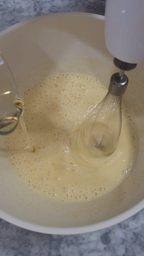 Dans un bol, montez les œufs avec le sucre, la vanilline et le zeste de citron râpé pendant environ 4/5 minutes, jusqu’à obtenir un mélange clair, gonflé et mousseux